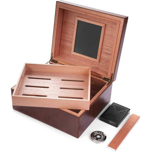 Cedar & Leather Cigar Storage Box Well Seal Design with Tray and Adjustable Divider